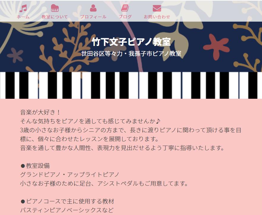 竹下文子ピアノ教室は、子供(3歳〜)からシニアの方まで、生徒さんが長くピアノに関わっていける事を目標に、個々に合わせたレッスンを展開しているピアノ教室。