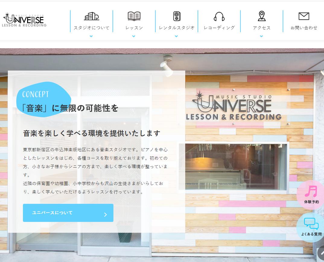ミュージックスタジオ ユニバースは、楽器・声楽レッスンが受講できる音楽教室で、レコーディング可能なレンタルスタジオも提供しています。