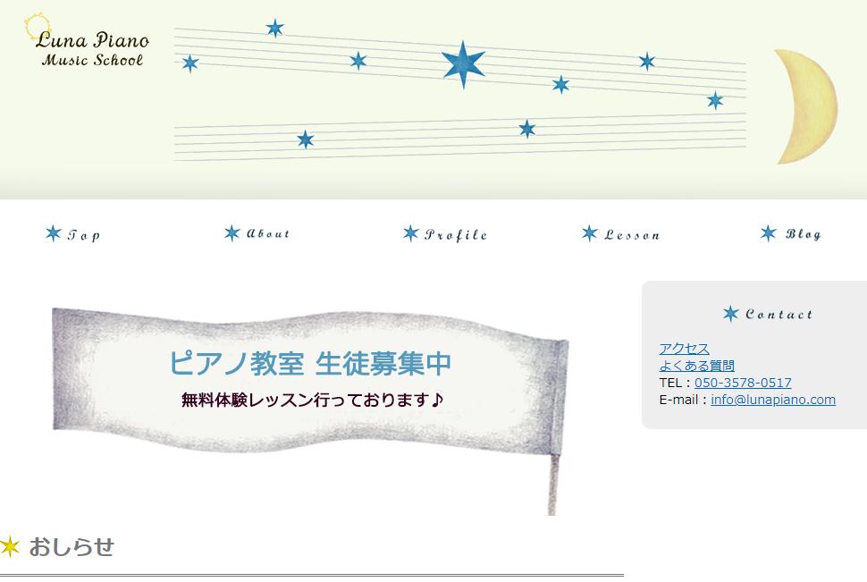 Luna Piano Music School(ルナ ピアノミュージックスクール)は、ピアノを通じて「音楽大好き人間」を育てること、そして、一つのことを毎日コツコツと頑張る姿勢を身に付けることを念頭に置いたレッスンを展開しているピアノ教室。